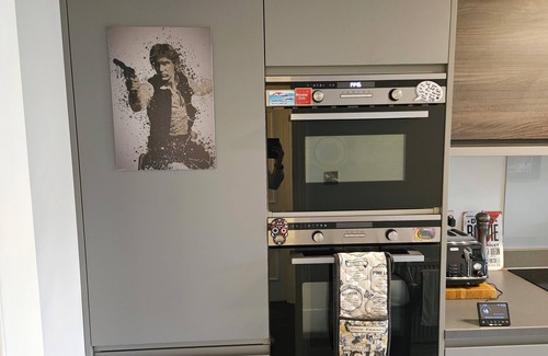 Sleek grey units, double oven and breakfast bar for two make cooking effortless, while a washer-dryer keeps luggage light.