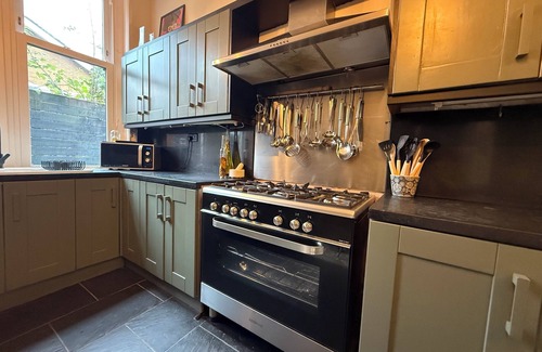 The vibe is effortlessly cool with soulful touches throughout including a show stopping pink velvet sofa, vinyl player, curated art, and a bar setup in the lounge. Cook with ease in the rustic-modern kitchen, fully stocked with a gas range cooker, air fryer, Nutribullet, juicer, slow cooker and everything you need for family feasts or lazy brunches.