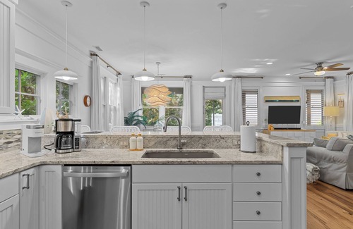 Stylish + Family Friendly - 2 Carts, 2 Clubs, Mins to E Beach, Kayak Our Dock is located in Keepers Landing. Stylish + Family Friendly - 2 Carts, 2 Clubs, Mins to E Beach, Kayak Our Dock provides accommodation, featuring Pool, TV, Bedding/Linens, among other amenities. This House features Pool, TV, Bedding/Linens, to make your stay a comfortable one.