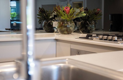 The modern kitchen features stone benchtops, dishwasher, oven, microwave, and coffee machine – ideal for extended stays. A full laundry (washer/dryer), huge smart TV with Netflix, and reverse-cycle A/C ensure every convenience.