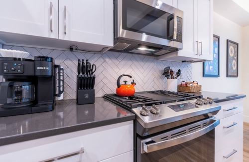 Main Level: The fully stocked kitchen includes everything you need for meal preparation, with a dining table that seats four. The stylish living room offers a large smart TV over the fireplace. Step outside to the patio, which seats four and features a propane BBQ for outdoor cooking. A stacked washer and dryer are conveniently located near the entry.