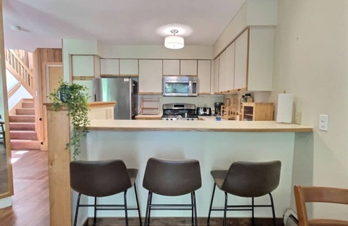 You`ll have exclusive access to the entire condo unit. You`ll walk in to the entrance with ample storage and into the soaring main living room with 2 stories ceilings and loads of light. To the left is one King bedroom with a full en suite bath. Up the stairs to a second king bedroom with full en suite bath. There is a half bathroom on the main floor with connected laundry. There is a giant TV, wood burning fireplace, leather sofa, office space with super fast wifi and a dining room table and bar. The back deck has views to the forest and showcases an outdoor living area and Weber grill. The house has high-speed wireless Internet, Roku TVs with streaming your subscriptions such as TV, Netflix and Amazon Prime Video. The kitchen is fully equipped with microwave, dishwasher, stove, fridge, cookware, coffee maker, dinnerware, utensils and more.