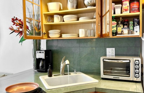 – EQUIPPED KITCHEN with everything you need for cooking, including: plug-in "cooktop / stovetop," convection toaster-oven, large fridge/freezer, pots & pans, microwave.