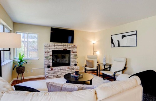 Sunlit Spacious living area with vaulted ceilings, modern decor and natural lighting. Dining area with tall ceilings, picture windows seats 8 ~ 4 bedrooms with comfy bedding, closets and 2 baths are upstairs. Open concept family room with plush seating and big screen tv opens into the kitchen and lush patio area for Al-fresco dining with friends and family to enjoy! Hot tub, anyone?! Plus fire table for those starry nights with a glass of wine or cup of cocoa!