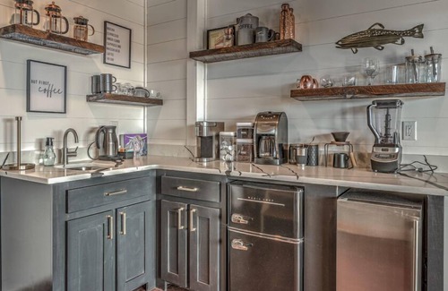 The bedroom accommodations are lush and inviting, with all bathrooms having their own ensuite baths with mountain views from every bedroom. Open up the glass doors in the bedrooms and step on out to the porch. Additionally, there's a lovely wet bar in the basement with a Keurig, drip coffeemaker, pour over and French press, and more. It's a great coffee bar to begin the day!