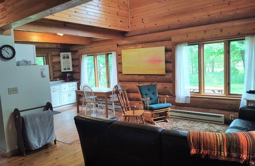 Take a beautiful car ferry from Northport, WI, to relax and unwind in rustic comfort. Sit on the deck or walk along the short boardwalk to watch a gorgeous sunrise; sit around the campfire to enjoy million-star skies. The cabin offers a beautiful propane stove (think: woodstove look without the woodstove mess), as well as electric baseboard heat; full kitchen, comfy living room with a high ceiling & skylights, cards & cribbage & games; no wifi but a great selection of DVDs to enjoy with the whole family.