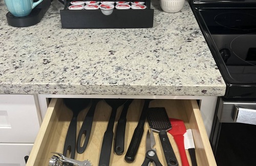 The fully equipped kitchen has everything you need to prepare delicious meals, including pots, a knife set and a Keurig coffee maker to start your day with a fresh cup of coffee. We also have as assortment of teas.