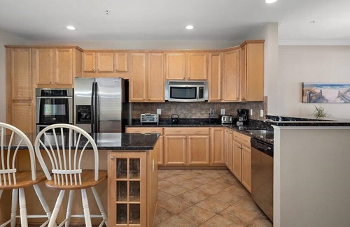 This large townhome has 4 levels comfortably sleeping 12 in its 5 bedrooms. The living room and kitchen area allow for plenty of room when the group is together, yet the multiple levels and 4 balconies allow everyone their own quiet space to relax. As you enter the first floor you'll find a bedroom with a queen bed, full bathroom and a smart TV. It's a great location for the couple that want some privacy. On the main level you'll find the living room area with a queen-size sleeper sofa and TV with cable. The kitchen area features large cabinets, granite countertops, stainless steel appliances and is ready to cook those cost-saving meals at home. Kitchen seating includes a large kitchen table, island seating and oval dining room table that can double as a game table. On the 3rd floor, you'll find 3 bedrooms. The master bedroom has a king-size bed and smart TV. The master bath has a stand-up shower and soaking tub. Bedroom 3 has two twins and bedroom 4 has a double. The hallway bath has a combination tub and shower. The top level has a queen-size bed, twin-size sleeper sofa and a smart TV. The bath has a combination tub and shower. There is a full-size washer and of course free Wi-Fi. The garage and parking pad allow for 3 cars to park. You will also find a grill, 6 beach chairs and a wagon for easy transport of your items to the beach or pool. The outside shower is great for washing up after a long day at the beach!