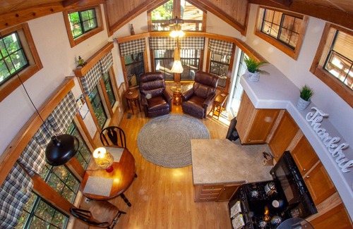 This cozy one bedroom, two loft cabin, sleeps 5 people. Clean, modern and comfortable. The master bedroom has a queen size bed, loft bedroom #1 has two twin beds, and loft bedroom #2 has one twin bed.