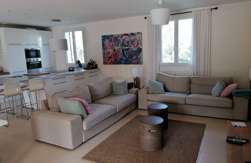 In the heart of Gard Provence, in a small medieval village, the villa is located 3 km from Pont du Gard and 10 km from Uzes. Completely equipped the house is composed of a magnificent living room with large fully equipped US kitchen (fridge, freezer, oven, microwave oven, cooking hobs, dishwasher)