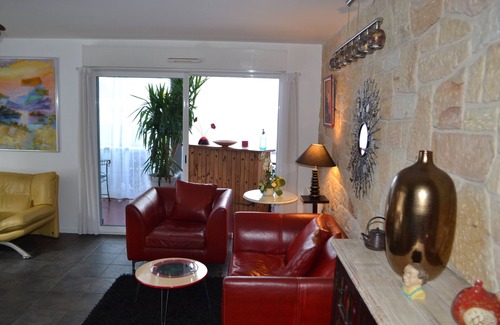 Overlooks a 10 m2 tiled terrace. Electric blind for an aperitif in the shade. Leather sofas (yellow) TV and red corner (Reading and Aperitif corner) TV 150 cm Canal Sat and Rugby +. Dining table in exotic wood L 180.