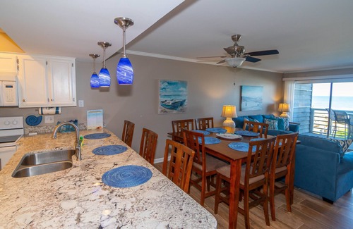 Surf Harbor 104 is a newly renovated three-bedroom, two-bathroom oceanfront condominium located on the first level for easy access and only 0.6 miles south of the Surfside Pier. This 1300 square foot unit has been professionally decorated and upgraded with luxurious granite countertops, new furnishings, ceramic tile, and flat-screen TVs in the living area and each bedroom. Enjoy your favorite meal around the gathering table that perfectly complements the unit and comfortably seats eight. Take in breathtaking ocean views from the living area, master bedroom, and furnished porches. Additional amenities include a wet bar and movie/game/puzzle library. Surf Harbor features parking for two vehicles, a gorgeous shared pool for you and your family to enjoy, and easy beach access.