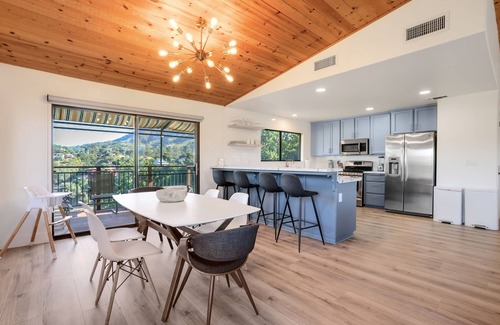 Walk up the entry stairs to the front porch, where you'll find comfortable patio furniture and a million-dollar view of Lake Nacimiento. Use the secure keypad to enter the home. On the main floor, an open-concept living, dining, and kitchen area have been expertly designed and remodeled in 2021. Beautiful details and original art set this vacation rental apart. The main floor features three bedrooms, each with a king bed, and one with a primary en suite and sliding glass doors to the back deck. A desk in the primary suite provides a comfortable space if you need to work while on vacation. Downstairs, you'll find garage access to the left, and a game room to the right with two more "kid rooms" outfitted with bunk beds. The game room is complete with flat-screen smart TV, comfortable lounge couches, and a Pac-Man arcade game. This is the perfect place for kids to hang out while the adults are enjoying themselves (and the view) upstairs!As you drive up, you'll notice ample parking for two vehicles (more than two vehicles must be permitted and parked separately).