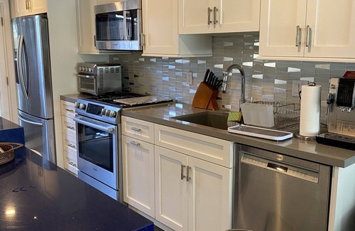 Our home has 3 bedrooms and 2 bathrooms. Enter the Dutch doors into the living room with comfortable matching mid century accent chairs and down filled couch. Enjoy your favorite game or movie on a 65 inch Sony flat screen. Additional TVs are located in each bedroom and the outside patio. The tvs are ROKU compatible and connect to your “Smart” phone or laptop. Adjacent to this in an open floor plan is a gourmet kitchen with DeLonghi automatic expresso/coffee maker, automatic dishwasher, kitchen appliances and kitchen ware. Designer details abound with attention to comfort to sooth your mind and body. Across from the kitchen is a dining table which comfortably seats six people.