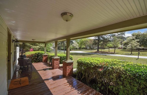This charming home is single-story and situated on a massive double lot. On one side attached to the home is a flat backyard where you can enjoy the fire pit or play outdoor games such as disc golf, croquet, corn hole, soccer, and more. The second lot is full of pine trees and azaleas. Though guests will not have access to the second lot, they can enjoy the flora from the porches and several large windows in the home.