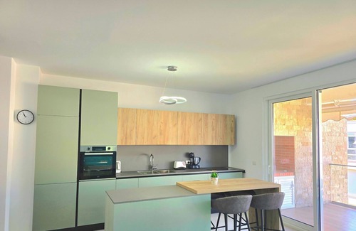 The property’s contemporary décor creates a relaxed but stylish atmosphere. The open-plan living area is full of light thanks to the large glass doors which lead out to the balcony. The seating area has a corner sofa, a flat-screen TV and a coffee table. The beautifully fitted kitchen is separated from the seating area by an island breakfast bar which seats 4 people. The immaculate kitchen is well-equipped with a cooker hob, oven, dishwasher and a fridge/freezer.