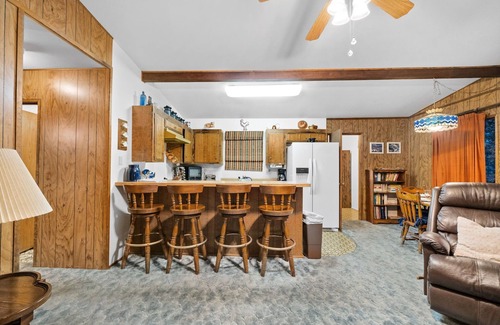 Tucked away in the pines, this retro cabin is private and peaceful. With just two steps up into the home, it offers easy access and a relaxing mountain retreat.