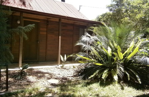 The cottage is surrounded by a natural garden of spotted gums and cycads.
