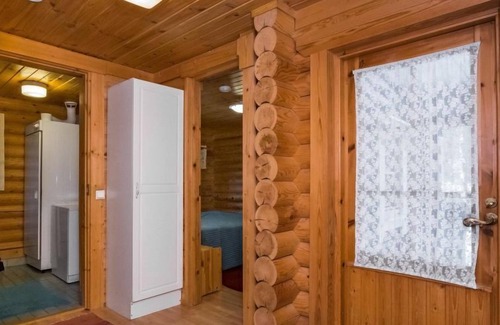 Log cabin 1984, expanded and renovated 2000, kitchenette, living room with spreadable sofa (two extra beds), bedroom (10 m²) with double bed, separate WC, dressing room, washroom, sauna, covered porch.