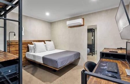 Welcome to a tech nomads’ getaway. This home has been renovated with industrial qualities of concrete, woodwork and steel. You have the choice of five workstations, with internet offering 1Gbit (1000Mbit) fibre, industrial kitchen facilities, outdoor entertaining area and a refreshing pool. Plus room for 4 vehicles secured behind large double gates. A very short walk and you are on beautiful Holloways Beach. And we welcome pets!