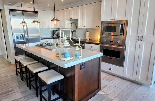 The kitchen and bar are equipped with all viking appliances. There is bar seating at the island as well as a table for 4. The kitchen is fully equipped.