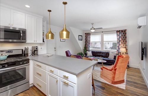The FROG is located on the second floor, with a private entrance, accessible through an outdoor stairway. You will have the entire guest suite to yourself with a keyless entry so you can come and go as you please. The space is bright and modern with some mid-century charm. You will be welcomed into the FROG with a bright, airy, open space that includes the living room, dining area and kitchen. The living room has a comfy couch that can be used for sleeping a third person and a large smart-TV (which includes Netflix). We provide a blue tooth soundbar speaker so you can play your tunes while getting ready for a big night out. The fully equipped kitchen has a refrigerator (with ice maker), dishwasher, microwave, farmhouse sink with garbage disposal, gas range, coffee maker and includes cookware and utensils if you want to prepare and enjoy a meal in. We’ve designed the kitchen with beautiful quartz countertops and a large peninsula that serves as a breakfast bar. We've installed beautiful hardwood floors throughout the apartment that are made from reclaimed barn wood. The bedroom has an amazingly comfortable queen size bed, a dresser and a large walk-in closet to store your clothes during your stay. We have equipped the FROG with it’s own tankless water heater so you can enjoy long, hot showers in your own full sized bathroom. While we do have private WiFi available to all guests, we do not have cable TV. You will also have access to a full size washer and dryer.