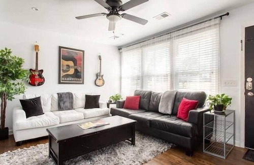 The living room is stylishly decorated with guitars on the walls, Smart TV (Netflix, Hulu, Disney+, etc.), and a sofa sleeper. The kitchen is steps away and is equipped with a standard coffee maker, French press, toaster, blender, and more to make you feel right at home. Cook up homemade meals or if you don't feel like cooking, check out one of Nashville's famous restaurants!