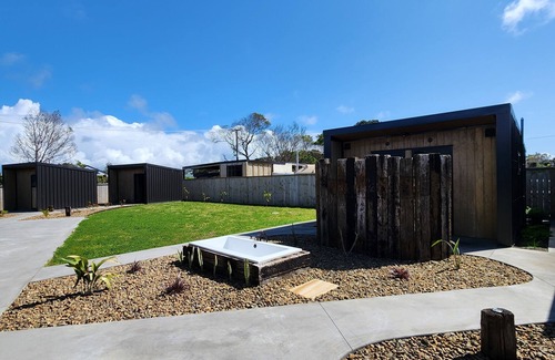 Situated at Kaimaumau, in the beautiful Far North of New Zealand, we have created a unique and spacious home away from home. A large central living area with kitchen dining and lounging, is surrounded by 6 cozy studios all with queen beds. All have sea views and are linked to the central living area by a series of garden paths. There are two bathrooms (shower, toilet and vanity in each bathroom), a separate laundry, and amongst the gardens an outdoor bath and outdoor shower.