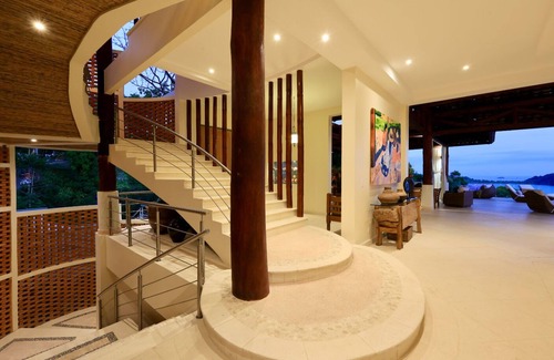 This luxury vacation villa offers privileged panoramic ocean views of Manuel Antonio. It overlooks the protected tropical rainforest stretching down to the Pacific Coast beaches. From here, you can behold the majestic Cathedral Point Peninsula and the scattered islands of Manuel Antonio National Park dotting the Pacific Ocean. This vacation home provides the most expansive and simply breathtaking scenery of Manuel Antonio.