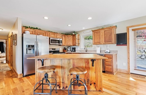 As you enter, you'll see the care and detail put into this cabin. With the open-concept layout of the kitchen/dining/living room, you'll immediately feel comfortable and at home. The kitchen is well stocked for families who wish to stay in to prep/cook meals. The propane grill is outside, just off the kitchen.
