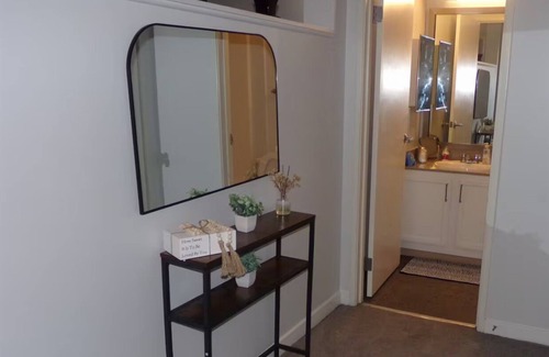Apartment is equipped with a queen size bed, full bathroom, living room space, access to complete kitchen, laundry room, full size sofa sleeper, TV and Wi-Fi access, and cabinet fireplace.