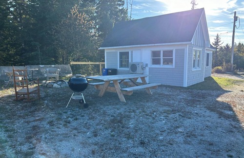 The Bodwell Cottage is equipped with small kitchen space with oven, sink and full size refrigerator, one bedroom with a double bed, a living area with couch and TV, and a full bathroom with a standing shower. Also includes A/C and heating capabilities via heat pump. There is also a small private deck on the backside of the house where main entrance is located, as pictured.
