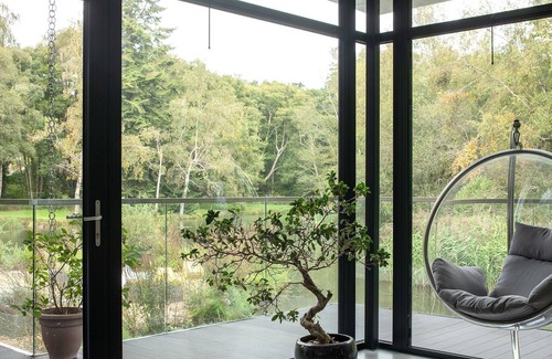 The house has been designed with togetherness and relaxation in mind. From the moment you step through the vibrant red front door, you're welcomed into an expansive, light-filled reception where soaring glass walls bring the surrounding woodland and lake into every moment of your stay.