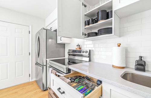 Inside, this inviting home is designed for relaxation and convenience. The living room greets you with a comfortable sofa, smart TV, and a cozy armchair, ideal for winding down after a day of exploring. The kitchen is warm and bright, fully stocked with essentials and equipped with stainless steel appliances and a kettle for tea lovers. With enough space for everyone, prepare your home-cooked meals together then gather at the dining table for six to enjoy conversation. Before the evening comes to an end, be sure to step out to your small private patio where you can savor the fresh Florida air. Every detail makes The Capri Villa a welcoming retreat for your Tampa stay.