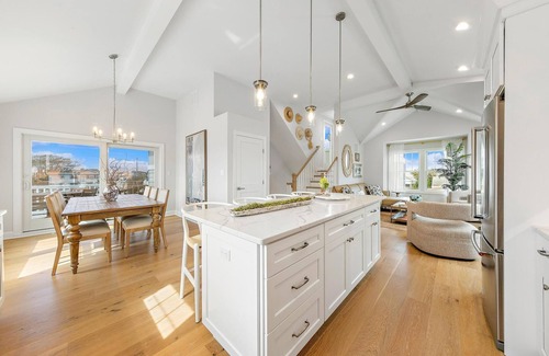 The first floor features a master suite with walk-in closet and double vanity master bath along with another three bedrooms and another full bath. The master suite is being designed to also be the perfect Bridal suite for the special bride. The top floor features an open concept living space filled with beautiful vaulted ceilings, a gas fireplace, a bright and airy kitchen with island seating, dining room and living room. Enjoy alfresco meals on the large deck off the dining area equipped with a gas grill. This floor also features a junior suite with a full bath. Relax and enjoy beautiful sunset views from your roof top deck. Special touches include gorgeous coastal finishes, engineered wide-plank hardwood floors, quartz countertops, fully tiled showers with hand sprays and modern hardware throughout. The fenced-in backyard includes an outdoor shower. Two-car garage with additional parking on driveway and street. Three outdoor spaces including backyard, dining deck, and rooftop deck, all to be furnished with outdoor furniture.