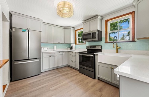 The main-level offers a spacious living area, modern fully-equipped kitchen, two dining spaces, finished porch, a Queen bedroom, and the 1st bathroom, all with beautiful furnishings and artwork. Upstairs you'll find a large Primary bedroom with King bed, another Queen bedroom, the final bedroom which holds a Double Bunk bed, a Bonus space with Day bed with Trundle and a Air Hockey table, and the 2nd bathroom. All rooms have lots of windows and beautiful light. The large fenced-in backyard features a built-in fire pit with Adirondack chairs and picnic table, perfect for all times of day and night.