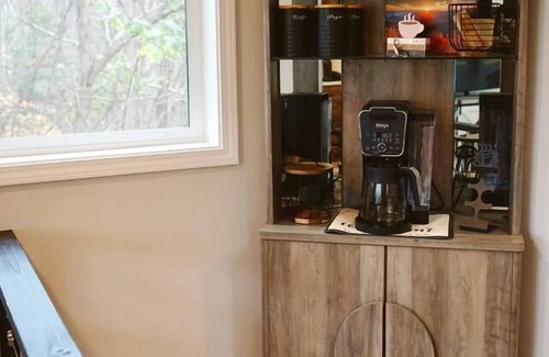 Inside our charming A-frame, you’ll find a warm and inviting living space with a mix of modern comfort and rustic charm. The main floor includes the master bedroom with a king-sized bed and access to the spacious back deck, where you can step outside to enjoy the crisp morning air. You will also find a bathroom with a toilet, custom tile shower, and full length mirror. The fully equipped kitchen features a full size fridge, microwave, and oven, along with all of the dishes and utensils you will need for any occasion. Wake up to our coffee bar, where you’ll find a Ninja coffee pot/Keurig pod combo. Jars of freshly ground coffee, Keurig pods, sugar, tea, and mugs that invite you to relax and enjoy your morning brew.