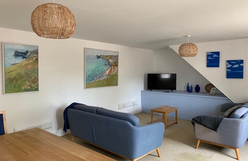 As you enter the property you will walk straight into the large lounge diner. In front of you is a large painting of the Cornish coast. There is a large oak dining table and a seating area with a 43" LG Smart TV with free Netflix, Amazon Prime and FreeSat. Art is a large part of The Courtyard Barn's appeal and there are many paintings by local artists as well as a large range of photographs.