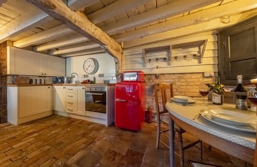 Restored to retain many original features such as exposed beams,this exquisite conversation is truly unique and memorable hideaway. On the ground floor the open plan living space features a large wood burning stove which adds warmth and romantic ambient light to chillier evenings. Nestle in after a long walk and let the tranquil surroundings relax you as you share a bottle of wine and watch a film on the television. The kitchen area is well-equipped with a coffee machine, washing machine and dishwasher, and offers everything you might need to create meals at home. A quaint breakfast table provides a spot to sit to share in food and conversation. Upstairs there is a rustic and charming large bedroom hosting a sumptuous French antique style super-king size bed under a vaulted ceiling. This room is served by an en-suite wet room with rainfall shower.