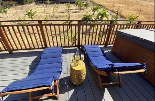 When you enter our "Elegant Barn" you will know that you have chosen the perfect space for your Sonoma County wine vacation! The lovely 2-story barn cottage is newly built with both comfort and style in mind. The location is perfect for a wine country vacation. Located on a 3 acre vineyard property surrounded by wineries and open sheep and goat pastures and easy walking, bike riding and driving to many of Healdsburg's best wineries. But still around only a mile away from downtown with it's many tasting rooms and famous restaurants! The space is sunny and light-drenched with windows that boast views of surrounding vineyards and sheep farms. Hardwood floors, wooden beams, tiled-in showers are some of features of this custom-built cottage. Upstairs has one bedroom with walk-in closet, a pull out sofa bed in the living room, large bathroom with walk-in shower and a living room floor-to-ceiling convertible glass doors that open onto the large deck are some of it's many appealing features. Downstairs has a separate detached room with comfy queen bed and an attached full bathroom and sitting area, and coffee station and mini-fridge. The upstairs deck is a luxury on it's own account. The large wrap-around deck is where you are bound to spend much of your time! It has comfy outdoor couches, an outdoor dining table, lounge chairs and even a private HOT TUB! All with views of the surrounding vineyards and sheep pastures. We are even pet friendly and provide guests with a small fenced yard for Fido to relax in (pets must be supervised at all times while in the yard). We care about the environment! Our entire property is solar powered and we even provide guests with a Tesla charging station for their stay. There is a 2-car garage for parking and ample driveway parking as well. We look forward to welcoming you to our beautiful "Elegant Barn" in beautiful Sonoma County wine! Please note that the upstairs living and bedroom area is located on the second story of the home and is not wheelchair accessible.