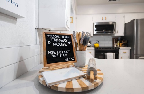 Inside, you'll find two living spaces with Smart TVs, reliable WiFi, comfortable and on-trend furniture, and thoughtfully designed areas for your party to gather. Your guests will enjoy two full bathrooms, including the luxurious master ensuite. The light bright kitchen is open to the living room and features an outstanding coffee bar with Keurig and Nespresso machines. The custom cocktail bar, built by the owner, was created just for our valued guests to enjoy a beverage after a day on the course. The second living room/game room has a mid-century vibe with stylish velvet couches and a bright blue pool table. Each of the three bedrooms has new mattresses, fresh linens, and high-end finishes. Let the fun continue outside with corn hole and other yard games, a large grassy area, mini golf, and a great patio with a fireplace where you can spend the cool summer nights under the stars.