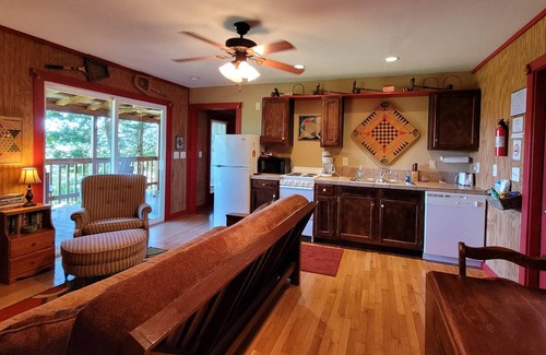 "The Gameroom" is decorated with a vintage sports and game theme.This two bedroom, two bath unit is our largest cabin -perfect for two couples or the average family. It has aqueen in one bedroom, two twins in the other, and a futon in the living area. It also includes a full kitchen, dishwasher, washer/dryer, and a 36 ft. covered back porch. This cabin providesone of the bestviews on the property andoverlooks the horse pastures and rolling hills.