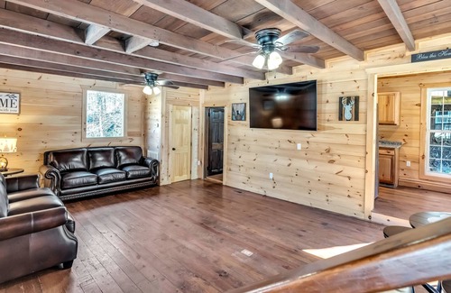 This beautiful 3 bedroom 3 bath cabin has a custom 1000 sqft deck that sits above the creek and has a view of the Waterfall. A custom wrap around deck with rockers makes the front porch perfect for taking in the afternoon sun. Stepping in the front door to the open living room and dining room provides all the space a family needs to gather. With 2 couches in the living room and 1 being a sleeper sofa and a large flat screen tv, the dining table that seats 4 with a large window viewing the creek. There is a full bathroom on this level with a shower tub combination and the fully equipped kitchen is ready for all your cooking needs.