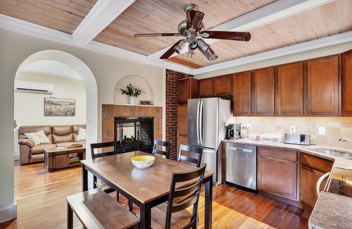 The apartment features two bedrooms, comprised of 2 fulls and 1 queen, sleeping up to 6 guests, ensuring a restful night's sleep for everyone in your group. The spacious living room is the perfect place to unwind, and the 55-inch smart TV with free cable provides entertainment for cozy nights in. High-speed WIFI is also available for free for your convenience. Please note that, while each unit has been insulated between floors and walls of the other units, this is a 100 year old home and you may hear motion or TV's from another unit, as there are 6 apartments in the building.