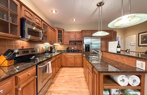 Step inside to discover the elegant living room, featuring tall cathedral ceilings, an abundance of seating, and a cozy gas fireplace. The main level also includes a unique aviation-themed room with a Nintendo Wii and comfortable seating, perfect for relaxation and entertainment. The kitchen is fully stocked and ready for you to prepare delicious meals, and the adjacent back porch provides a lovely setting for outdoor dining or unwinding in the fresh air.