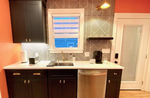 When you walk into the space, you'll immediately notice the pops of color. This small space packs a big punch with a full kitchen (and yes, full sized appliances including a full sized dishwasher), in unit full-sized stacked front loading laundry, a separate bedroom (queen-sized memory foam bed) with a ceiling fan, and an ensuite bathroom with a spacious walk-in shower.