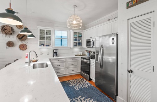 The house offers 5 bedrooms: on the first floor, two luxuriously appointed king bedrooms and a bedroom with two bunk beds and a twin trundle bed with a distinctly nautical theme. A bedroom with two double beds and full bath on the second floor, and a separate apartment with a King master bedroom with a full bath for more privacy. The home is large enough to bring the family but small enough to easily get around.