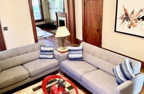 A huge historical home that can comfortably accommodate a large group or family. It has 4 queen-sized beds, a first-floor bedroom and bathroom, and a sofa couch that pulls out into a full-sized bed.