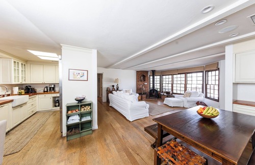 The charming, ivy covered main cottage is comprised of three bedrooms and two bathrooms. There are hardwood floors and French windows throughout. The cottage has a sunny, fully equipped Viking kitchen with solid cherry counter tops and a large European farm sink. The living area offers ample seating and a wood burning stove. The master suite has a California King bed, separate sitting area and a private spa tub. All natural materials and white, crisp Egyptian cotton sheets ensure a peaceful nights rest. The bright and airy secondary bedroom has two full beds and ample closet space. The third bedroom has a queen bed and French doors that open out onto the enchanting, secret garden.
