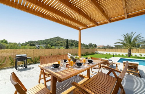 This beautiful newly build villa is the perfect accommodation for groups of up to 6 guests, looking to relax in the island’s quiet countryside. The accommodation offered is the elegant ground floor’s 116 sq.m. The villa offers 1 double bedroom with ensuite bathroom and shower, 1 double bedroom and 1 bedroom with 2 single beds (option for kingsize available). Every room in the villa is fully airconditioned, equipped with a Smart TV and access to Netflix and Amazon Prime to relax after enjoying a long day under the Rhodian sun. In the spacious living room you can enjoy a film on the 65-inch Smart TV while sinking in a modern cornershaped couch. In the fully equipped and functional kitchen you will be able to prepare any breakfast, lunch or dinner. The outdoor areas consist of a large green garden of 500 sq.m. with access to a large swimming pool (4x9 meters) for refreshing dips in the crystal blue waters(pool towels are provided), an outdoor dining table under a wooden pergola, an outdoor living room to enjoy the quiet summernights, wooden sunbeds with umbrellas to enjoy the shade on a hot summer day, and a charcoal American BBQ. The villa offers Wifi access to powerful internet keeping you connected in every corner of the property.